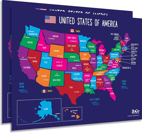 ZOCO - United States Map With Capitals Poster (2-Pack) - Laminated 17X22 - Educational USA Wall Chart For Kids - North America Geography, Social